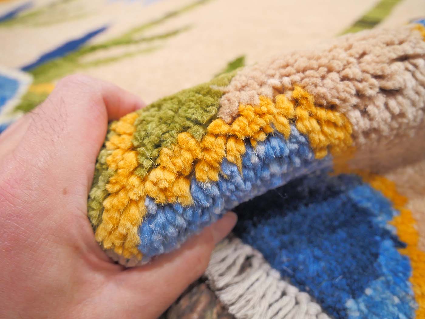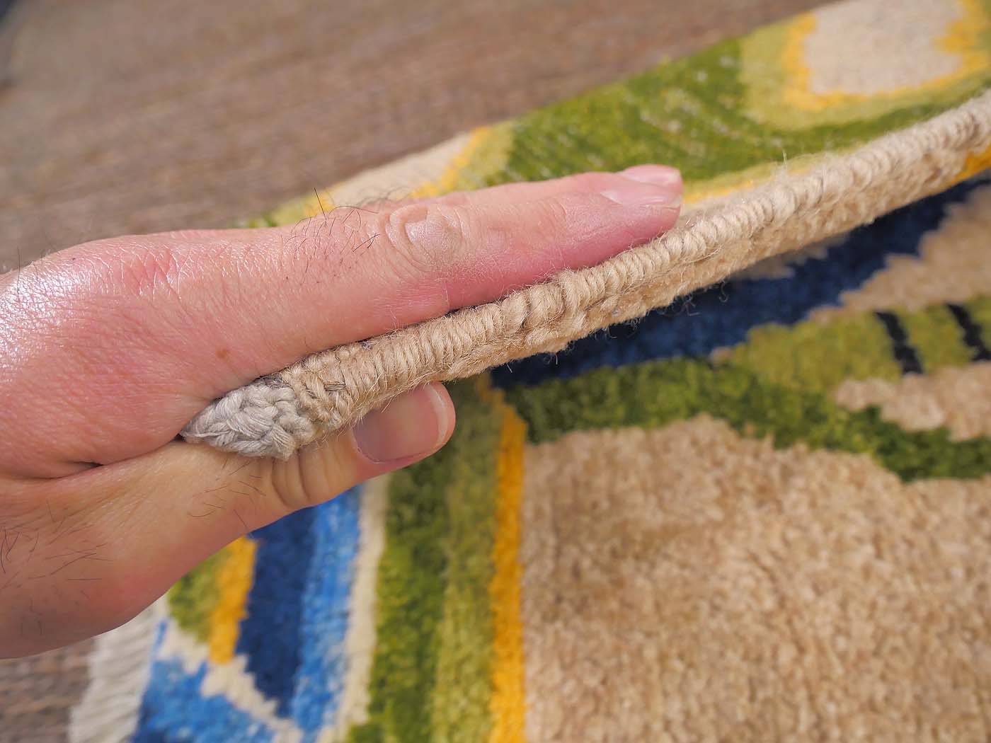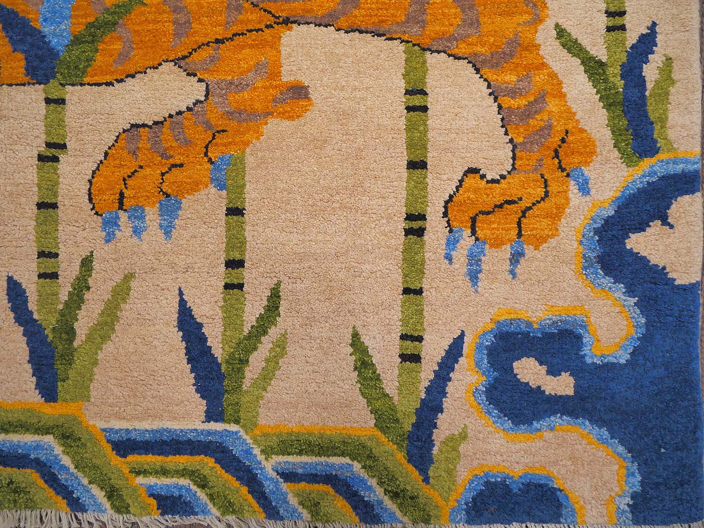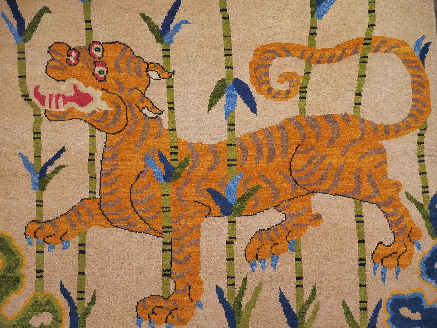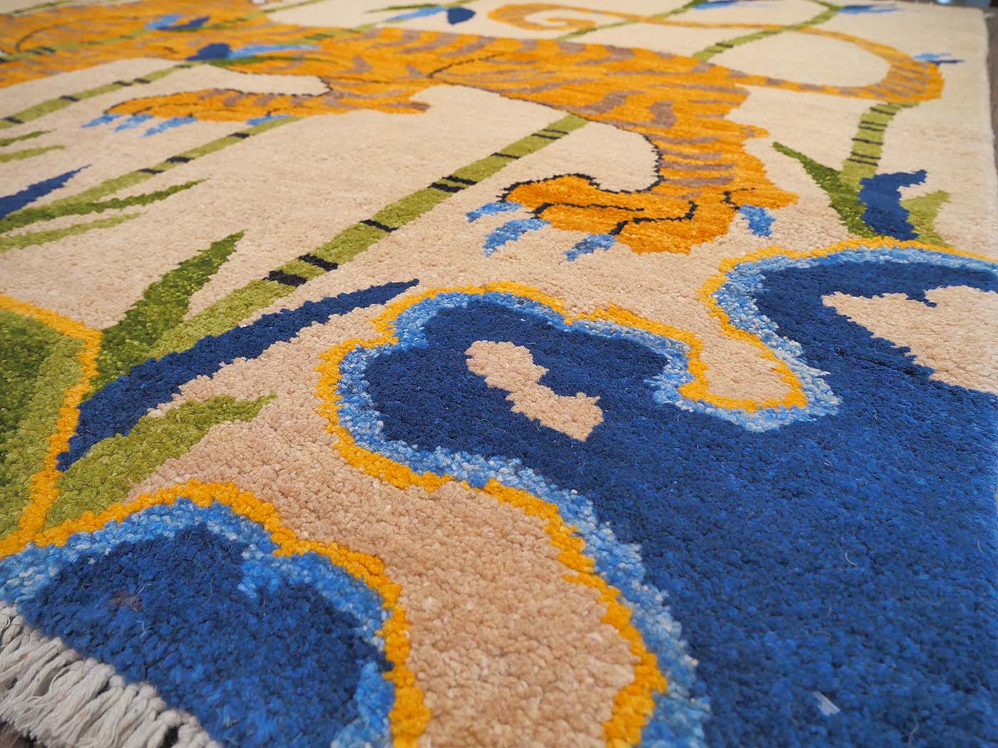 This thick hand knotted pile rug is made using handspun wool and custom made expressly for the Nomad Rugs team. This rug is woven in homage of the famous antique Tibetan Tiger rugs. In times past, tiger rugs (which were linked to tantric beliefs) were often gifted to the lamas in remote Tibetan monasteries. The tiger motif was thought to protect the person during meditation. This new rug was modeled on an antique rug and is woven with around 40kpi. The coarse knotting along with the long silky soft handspun wool and rich dyes give this rug a warm and cosy feel. This bespoke rug is both timelessly tribal and progressively modern. FREE Shipping and Easy Returns.