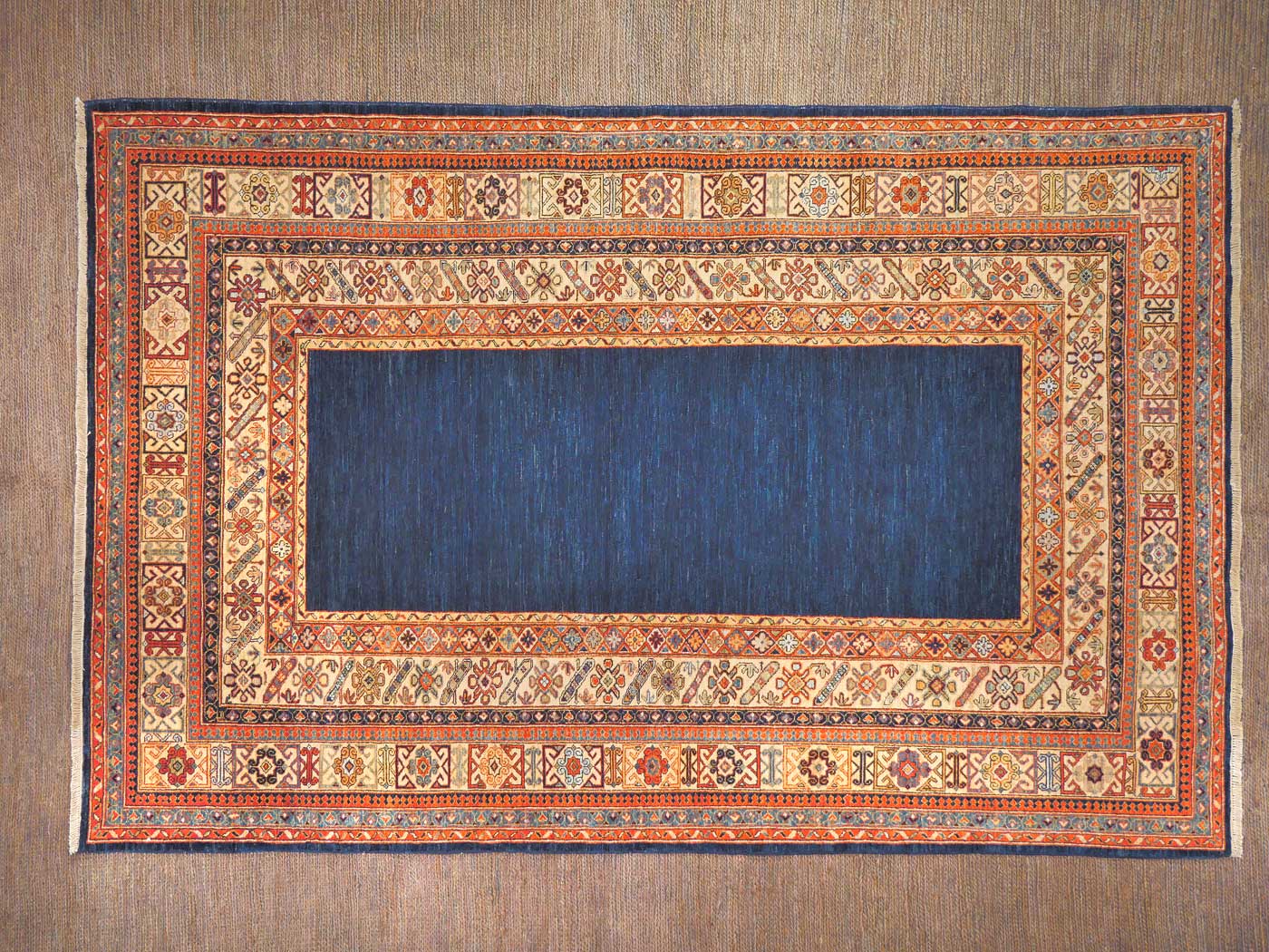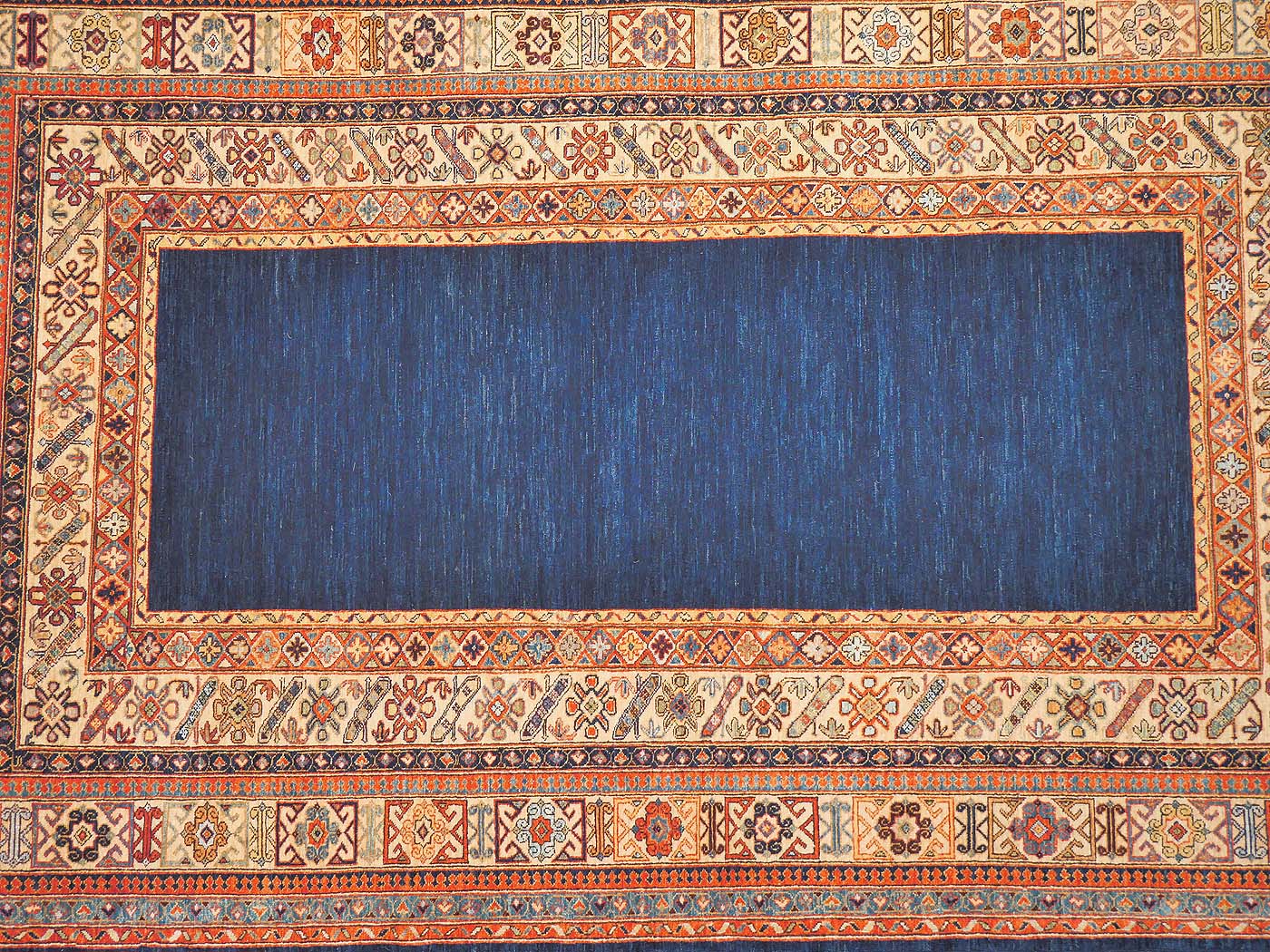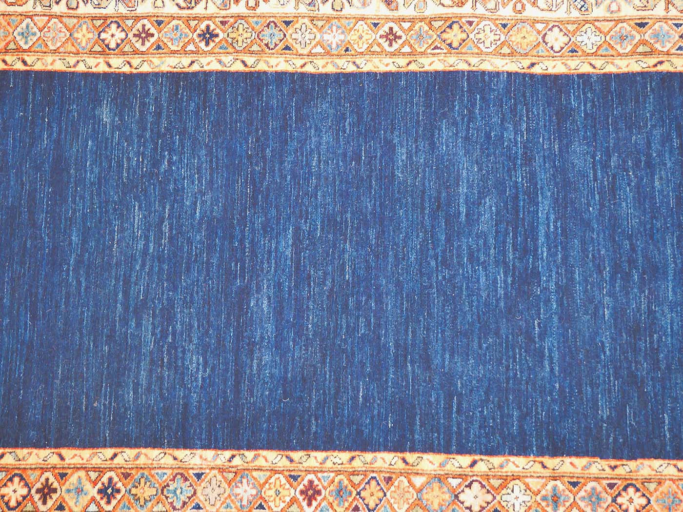 Hand knotted pile carpet made with all natural dyes, hand carded, handspun wool, and finely woven with 150kpi with a gorgeous open blue filed design. Asymmetrically knotted as is the tradition with the Ersari weavers who created this rug. This weaving project originated during the time these Turkmen people lived as refugees in Pakistan. Now most have moved back to their homelands in the north of Afghanistan where this carpet was woven. All weaving takes place in individual weaver’s homes. Proceeds from the sale of this rug benefit Barakat; helping communities thrive by providing education in rug weaving countries. FREE Shipping and Easy Returns.