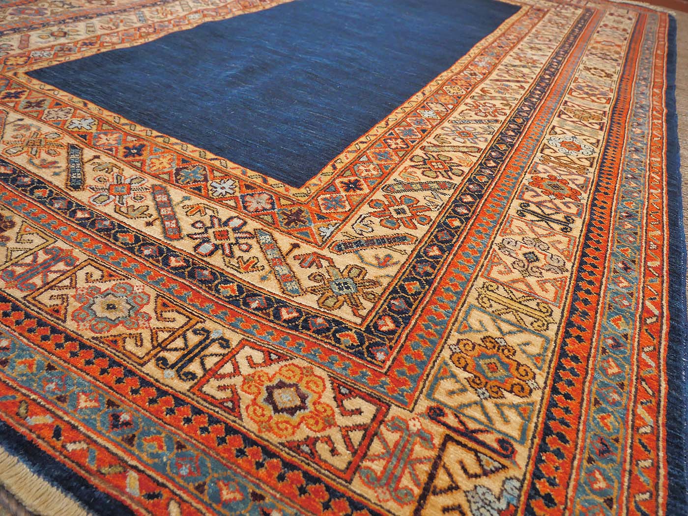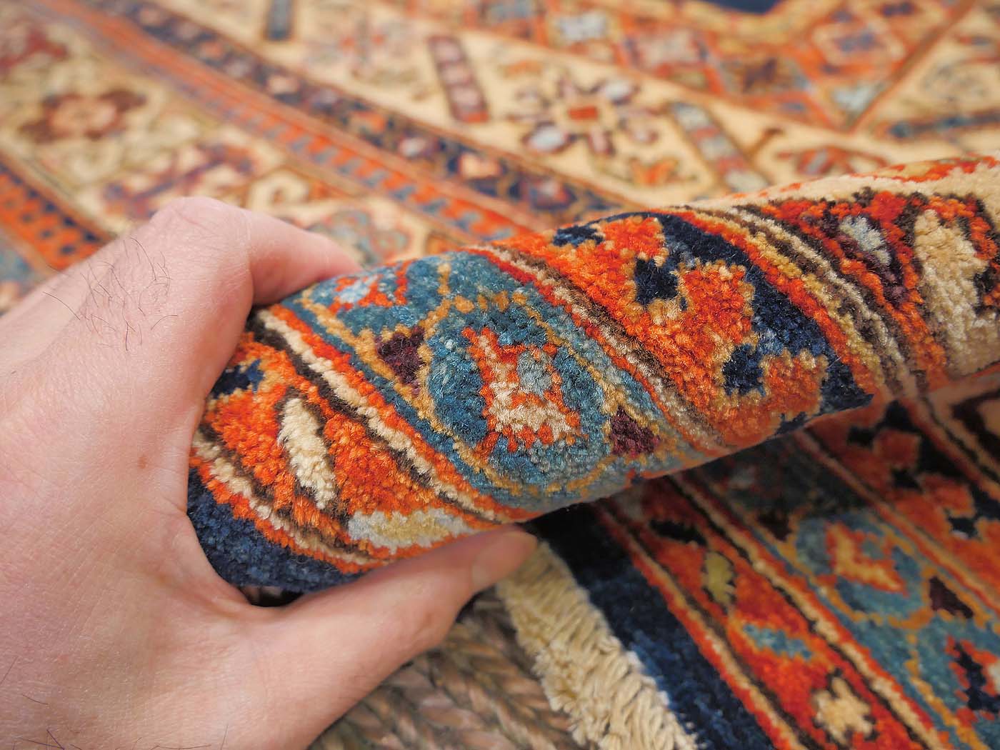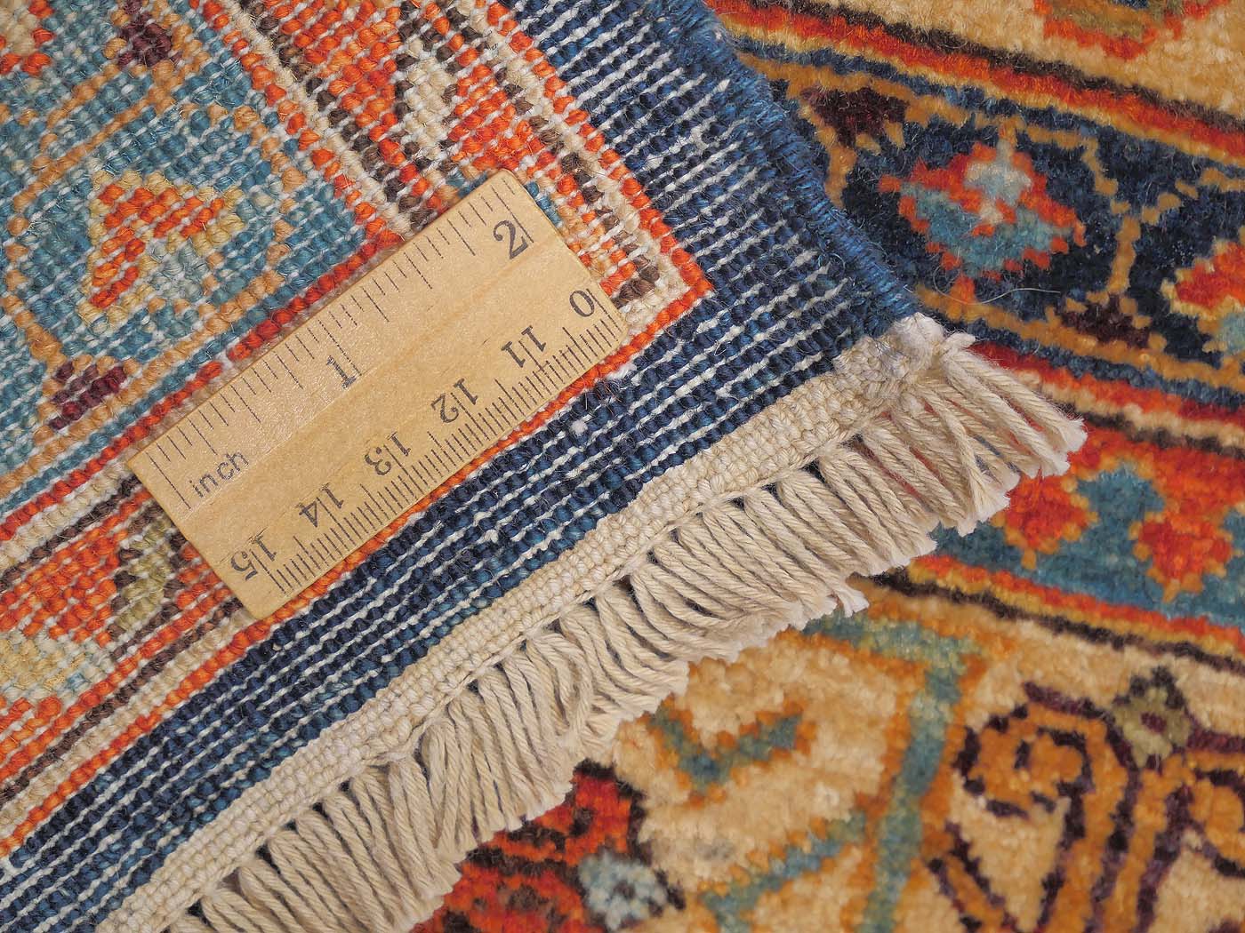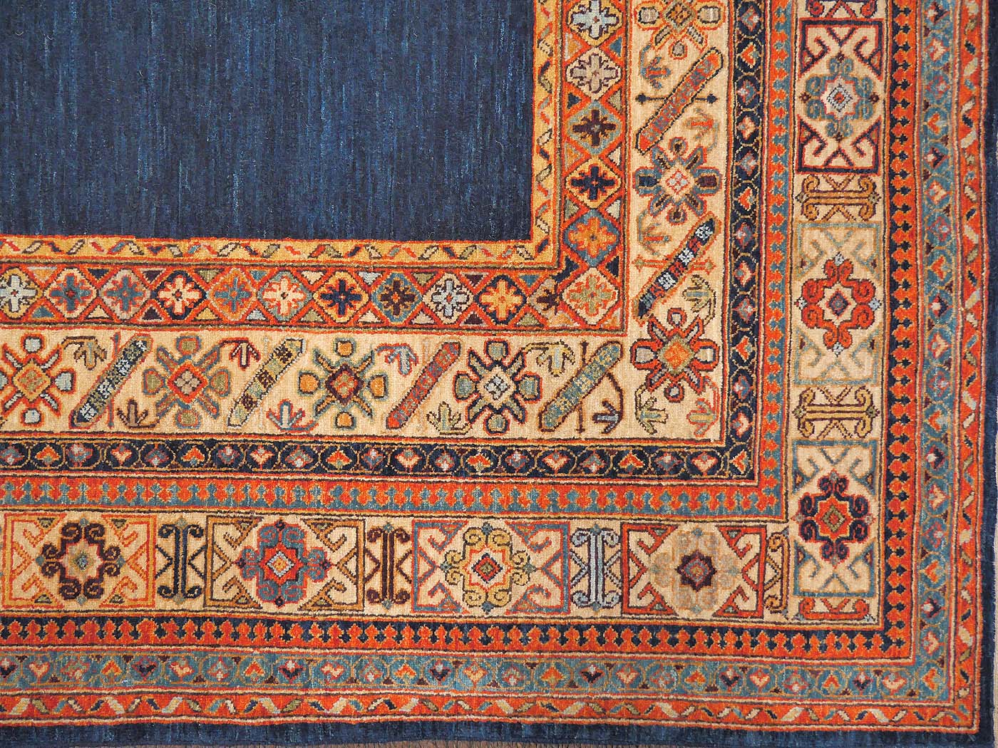 Hand knotted pile carpet made with all natural dyes, hand carded, handspun wool, and finely woven with 150kpi with a gorgeous open blue filed design. Asymmetrically knotted as is the tradition with the Ersari weavers who created this rug. This weaving project originated during the time these Turkmen people lived as refugees in Pakistan. Now most have moved back to their homelands in the north of Afghanistan where this carpet was woven. All weaving takes place in individual weaver’s homes. Proceeds from the sale of this rug benefit Barakat; helping communities thrive by providing education in rug weaving countries. FREE Shipping and Easy Returns.
