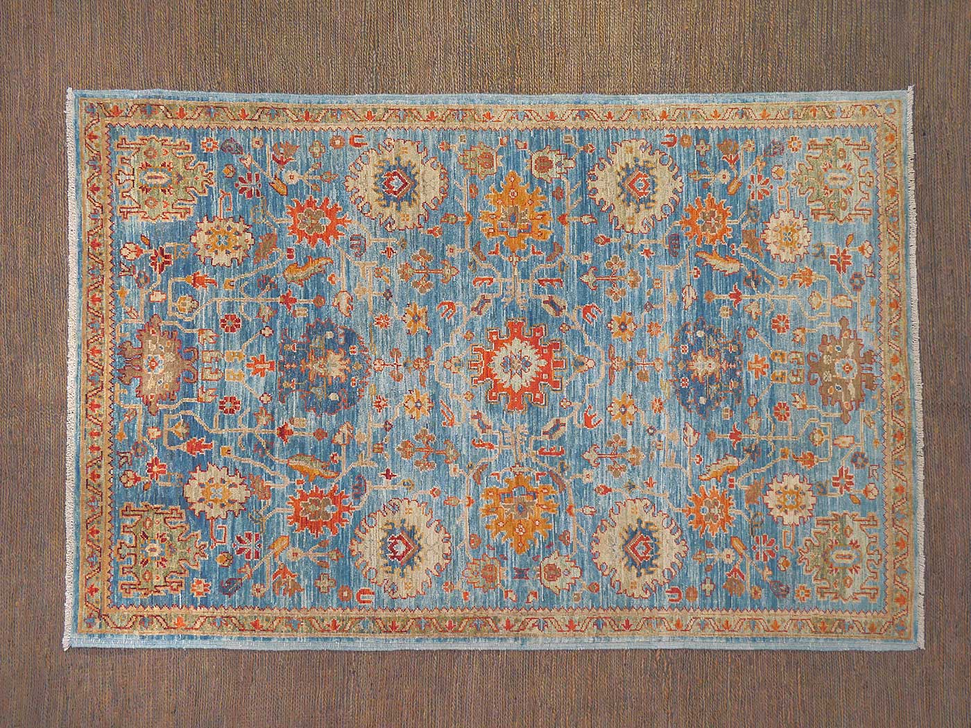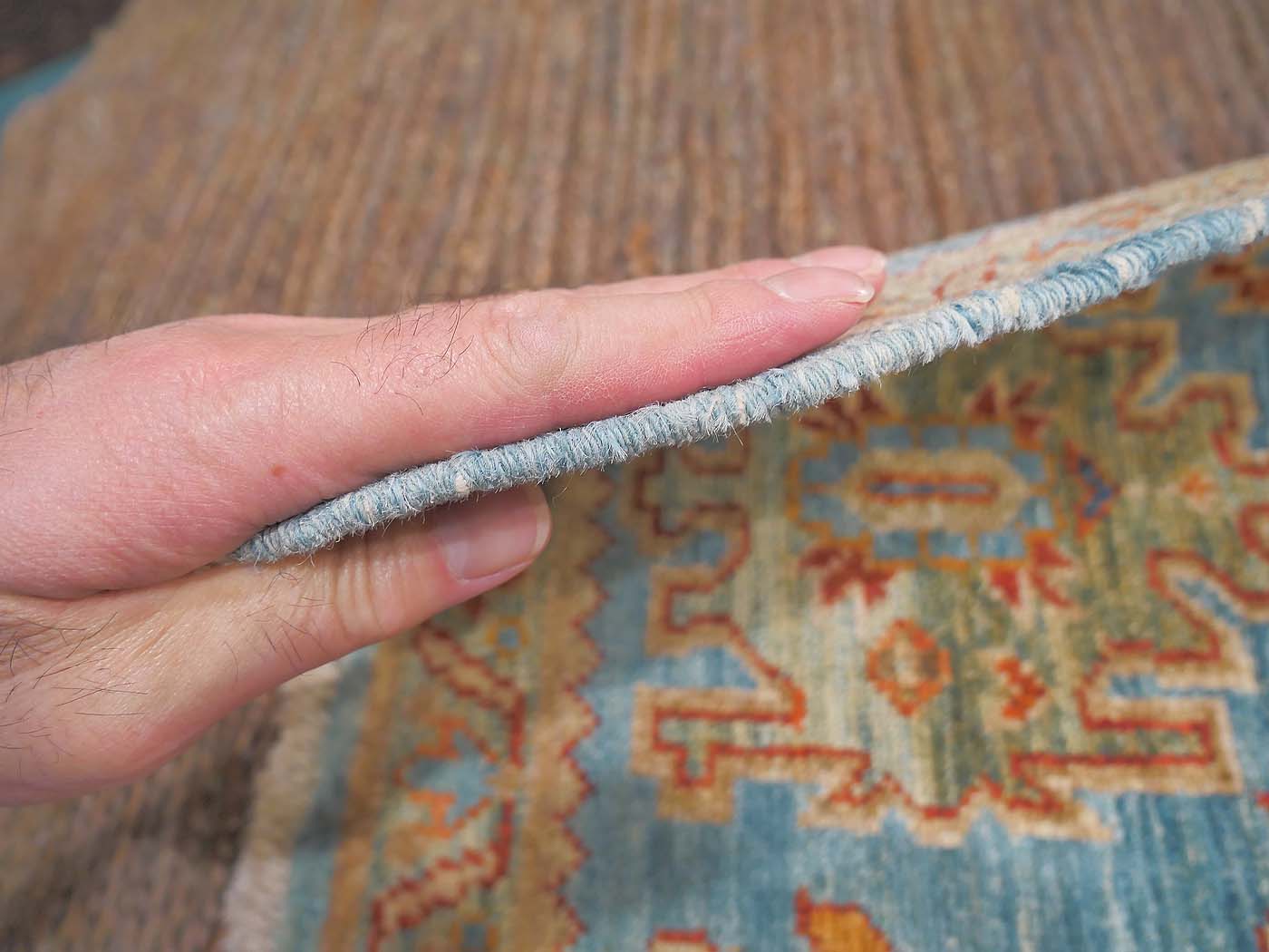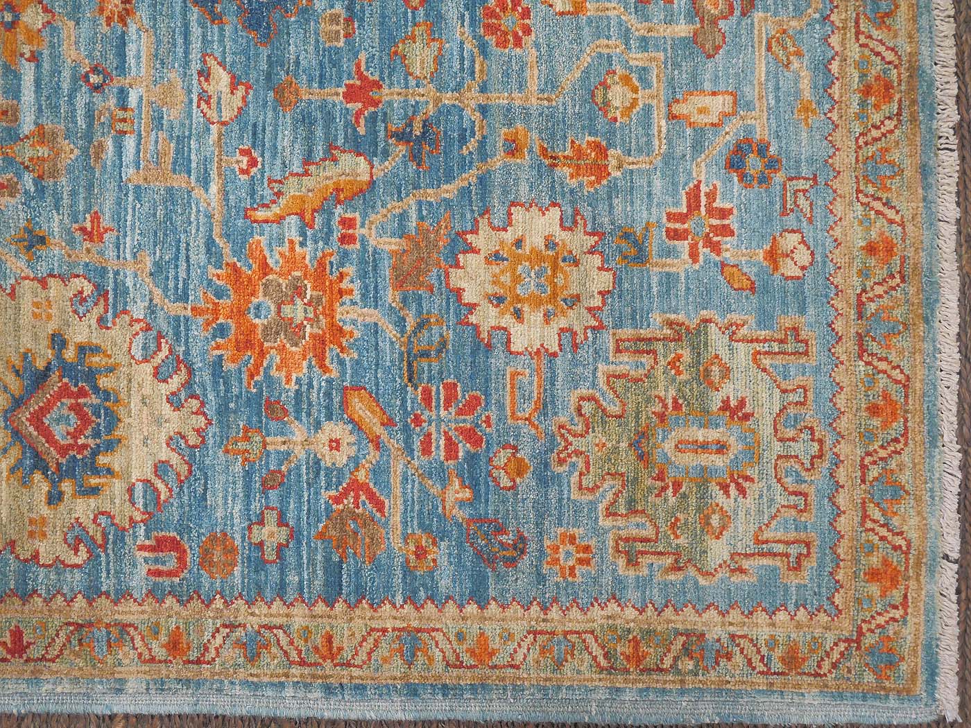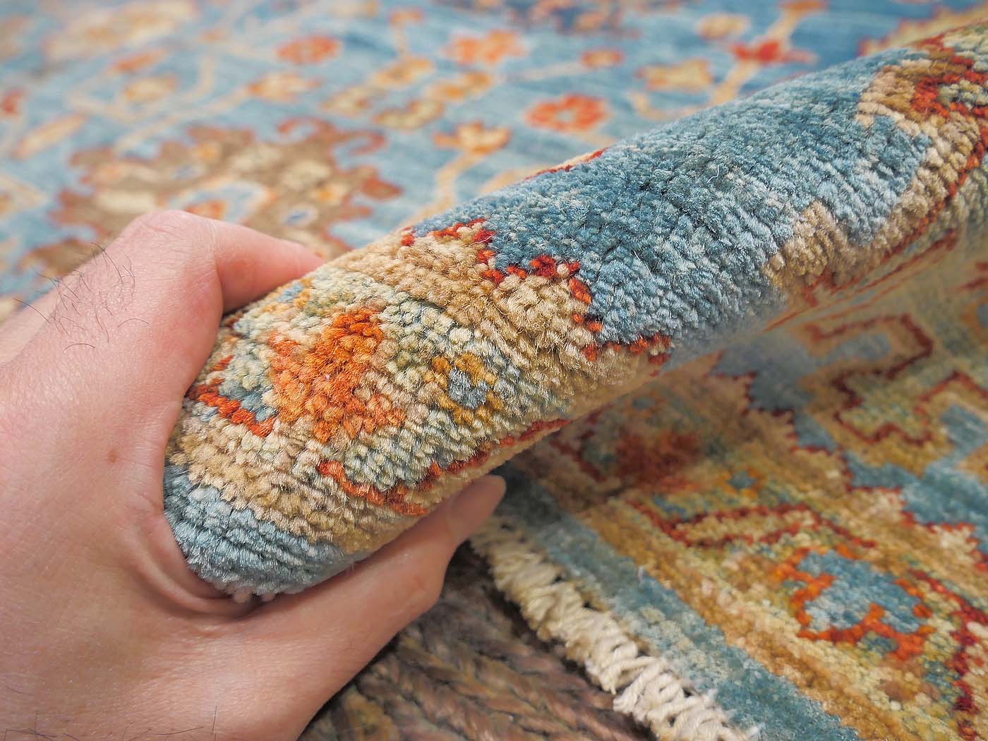 This hand knotted pile rug is made using 100% natural dyes and handspun wool. This rug is woven with around 90kpi. Weaving takes place in the northern areas of Afghanistan, the home of the Turkmen people. Carpet weaving is perhaps the most essential and revered cultural activity for Turkmen; something which traditionally all women take part in. The art of weaving is reverently passed on from mother to daughter with the weaving of these rugs taking place in individual family homes. Wonderful blues tones complete this lovely Oushak design carpet. Proceeds from the sale of this rug benefit Barakat; helping communities thrive by providing education in rug weaving countries. FREE Shipping and Easy Returns.