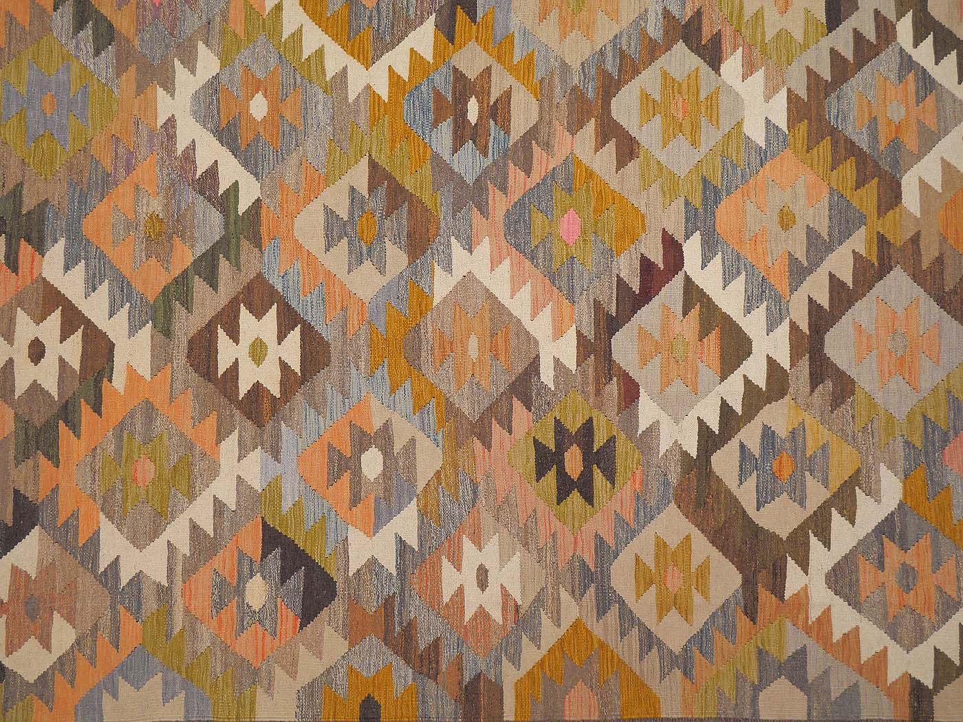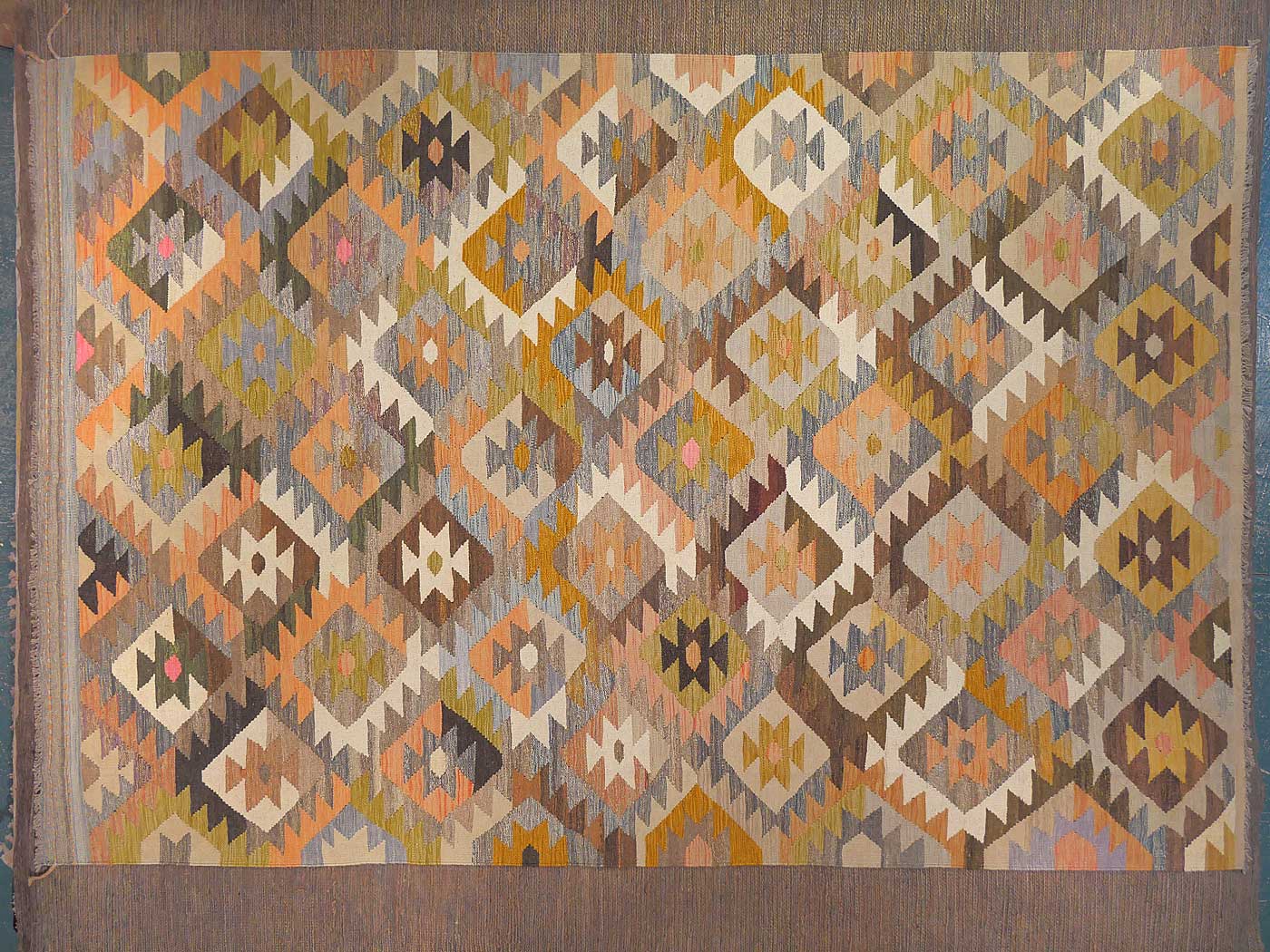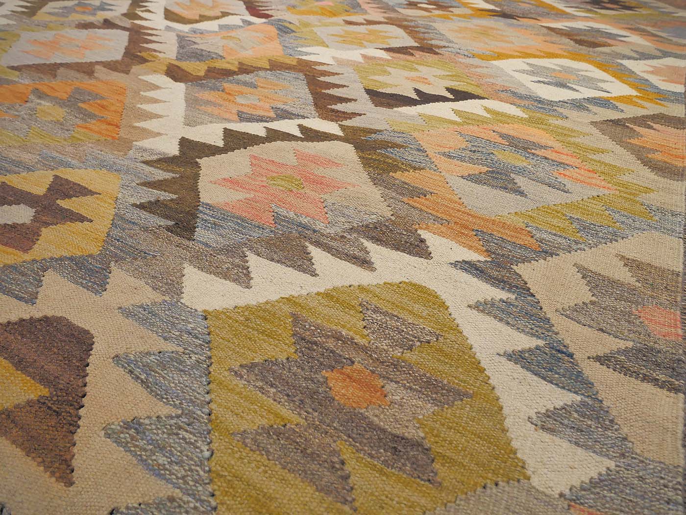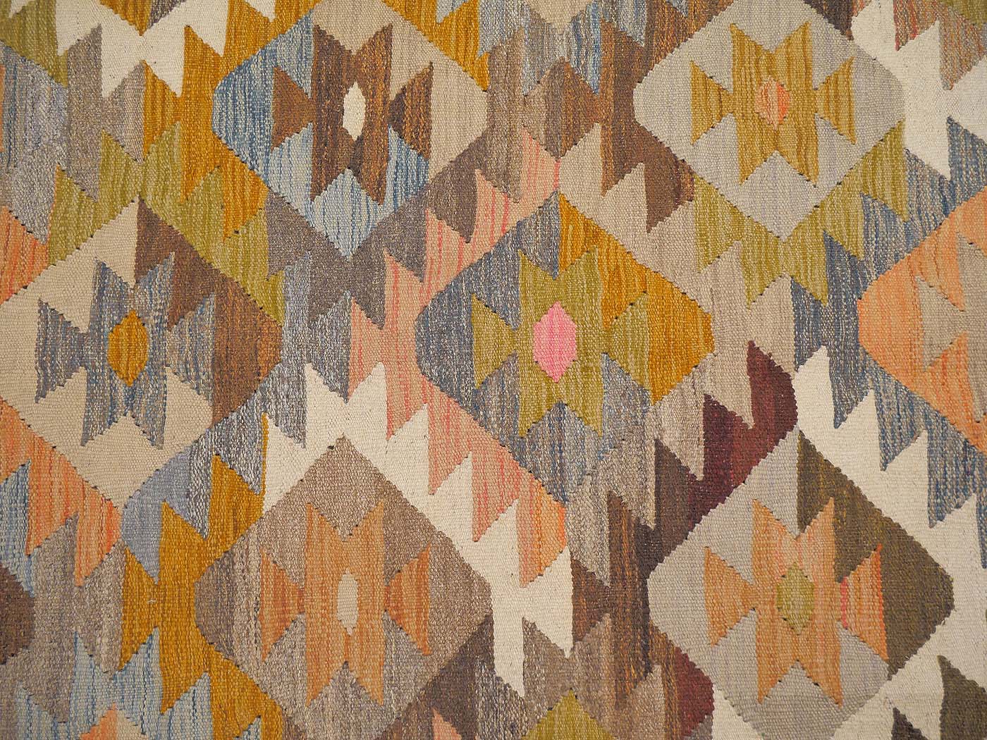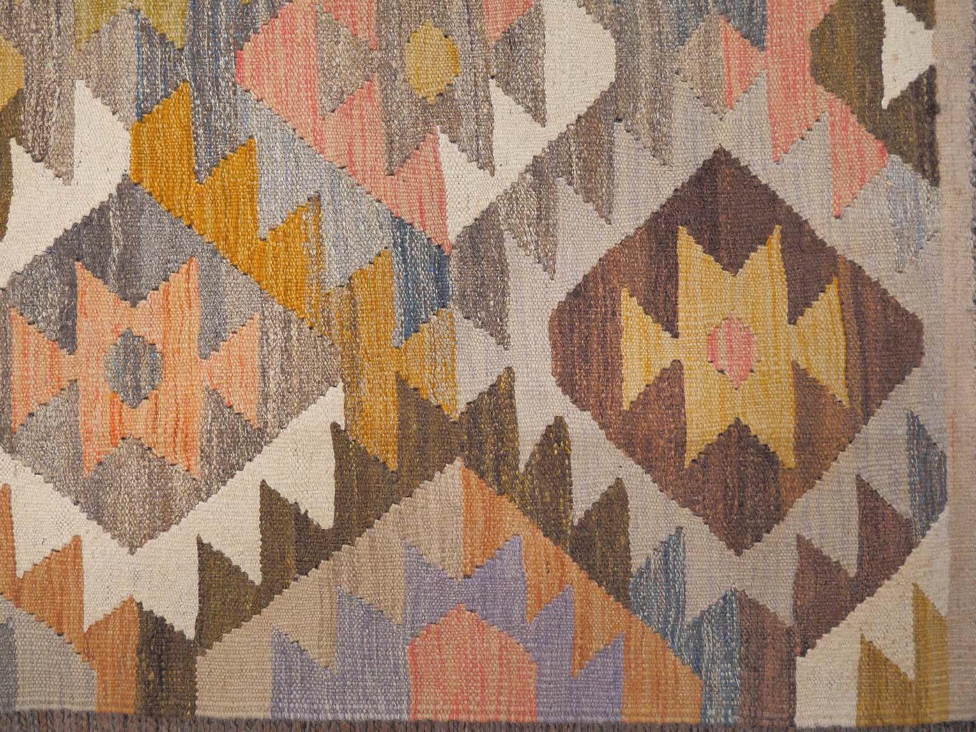 This hand made kilim rug is flat woven in a tapestry weave and made entirely of handspun Afghan wool. These wonderfully elegant rug are use soft pastel colors as well as natural variations of un-dyed wool. These are woven by Uzbek weavers in central Afghanistan near the city of Maimana. The archaic designs have changed little over the centuries. But the use of soft colors has updated these kilims for the modern home. This is a gorgeous tribal kilim entirely handwoven and crafted for years of enjoyment. FREE Shipping and Easy Returns.