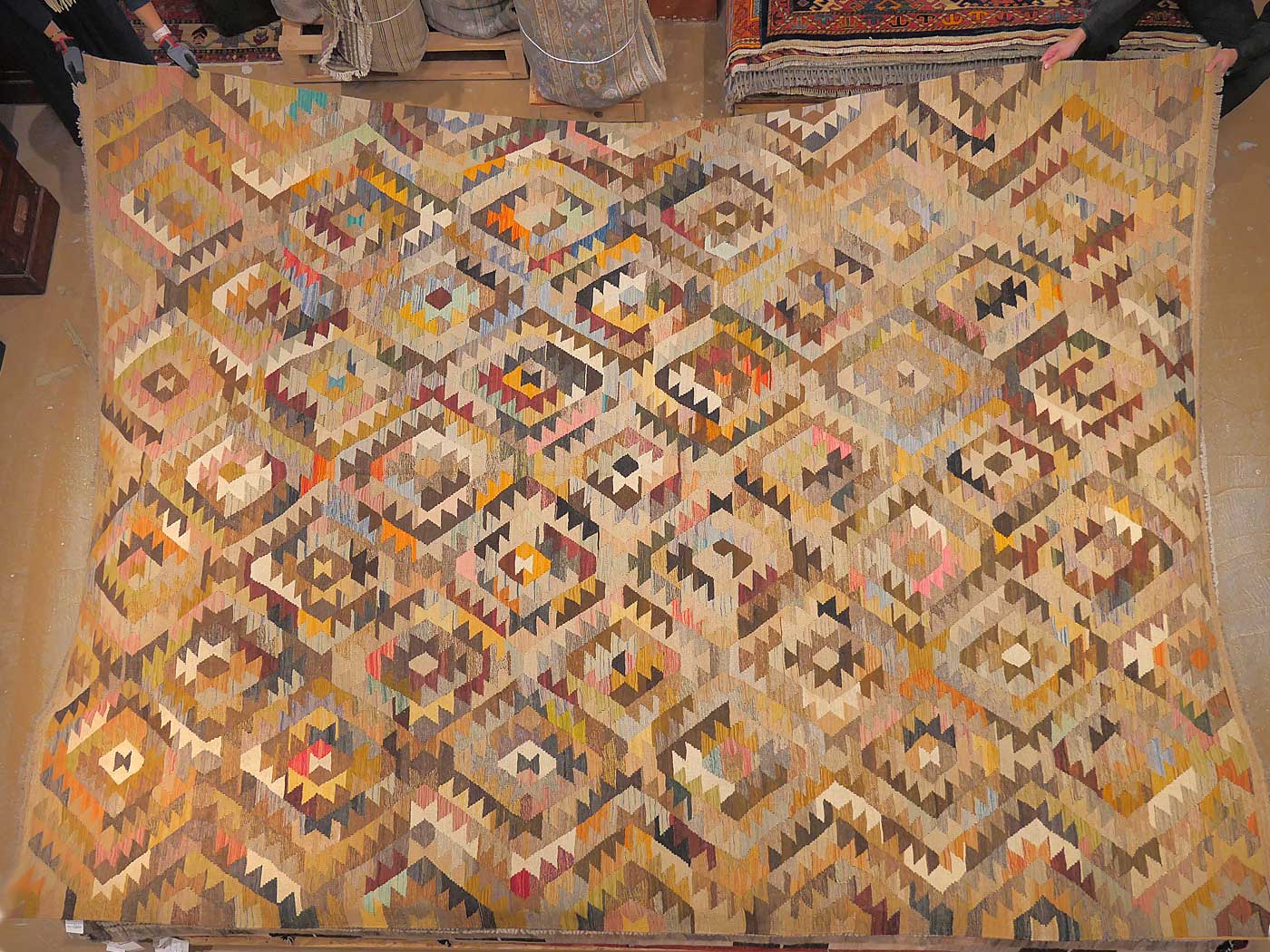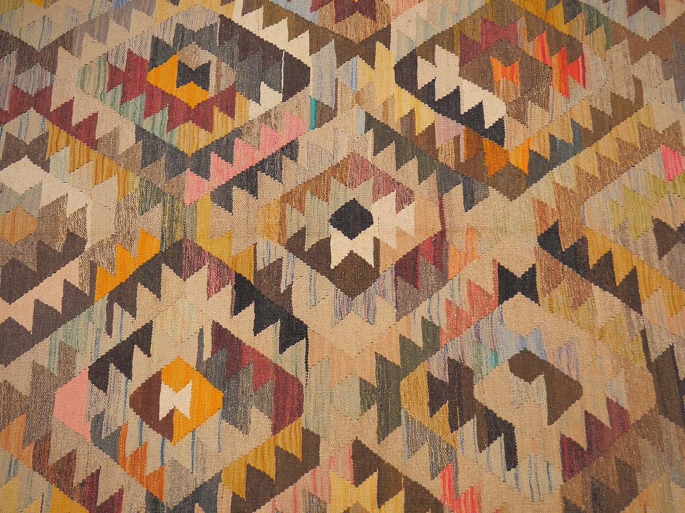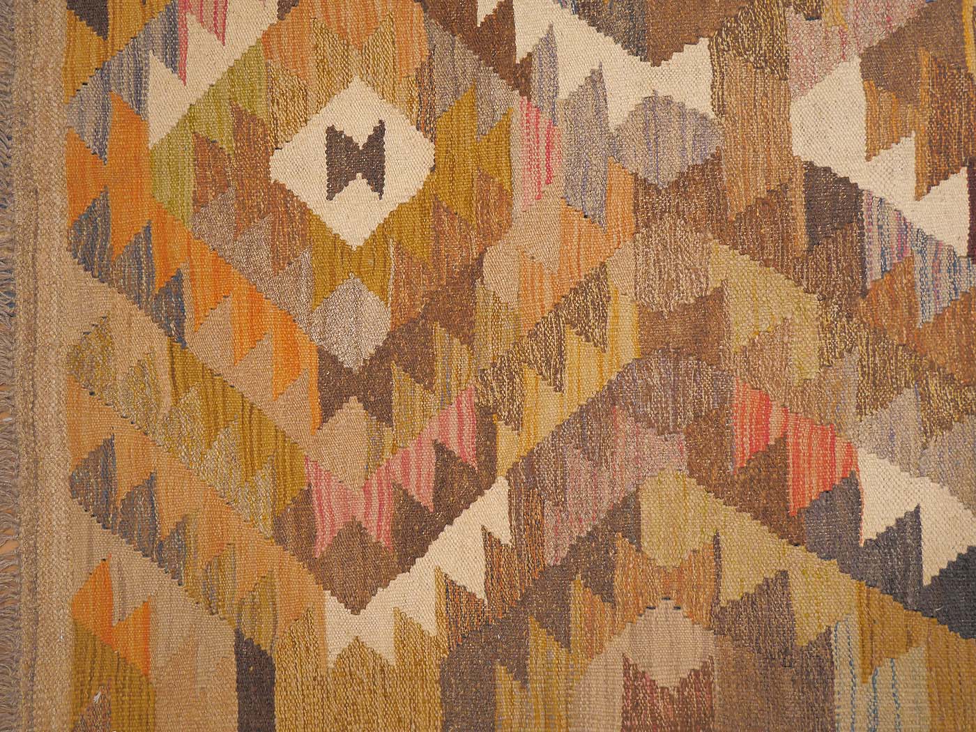This hand made kilim rug is flat woven in a tapestry weave and made entirely of handspun Afghan wool. These wonderfully elegant rug are use soft pastel colors as well as natural variations of un-dyed wool. These are woven by Uzbek weavers in central Afghanistan near the city of Maimana. The archaic designs have changed little over the centuries. But the use of soft colors has updated these kilims for the modern home. This is a gorgeous tribal kilim entirely handwoven and crafted for years of enjoyment. FREE Shipping and Easy Returns.