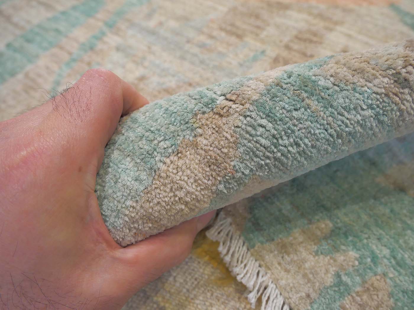 This hand knotted pile rug is made using natural dyes and handspun wool; commissioned by the Nomad Rugs design team and woven by Turquoise Mt. weavers. Thousands of women in Afghanistan are being supported in this weaving project which creates a sustainable livelihood for weaving families. Label Step ensure a comprehensive set of fair trade standards and environmentally friendly production. This rug features a lovely modern design in soft colors and a very fine weave of over 140kpsi. Entirely hand made. FREE Shipping and Easy Returns.