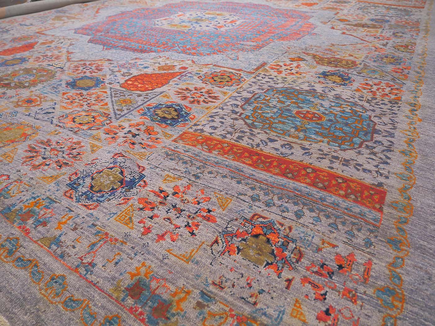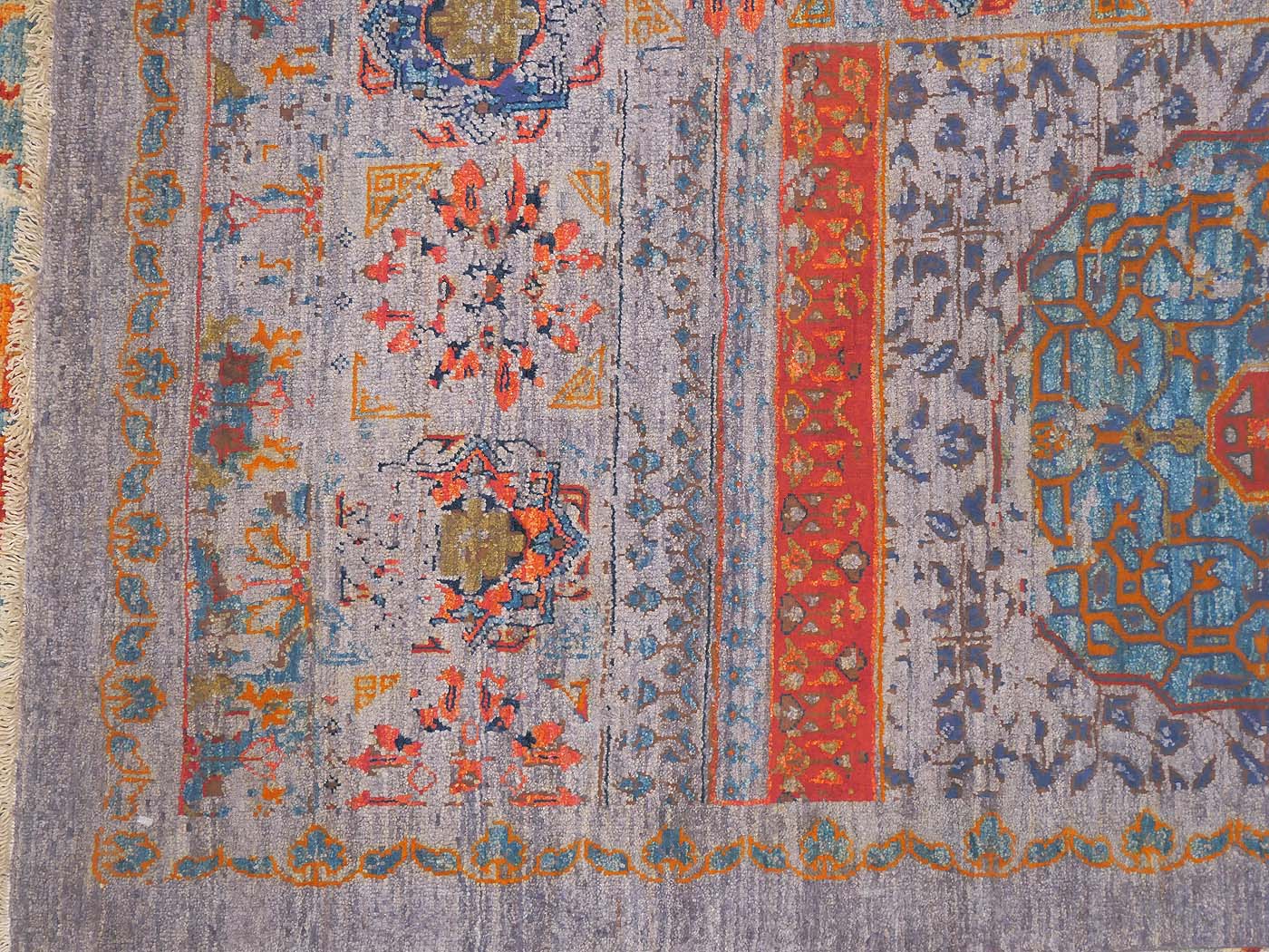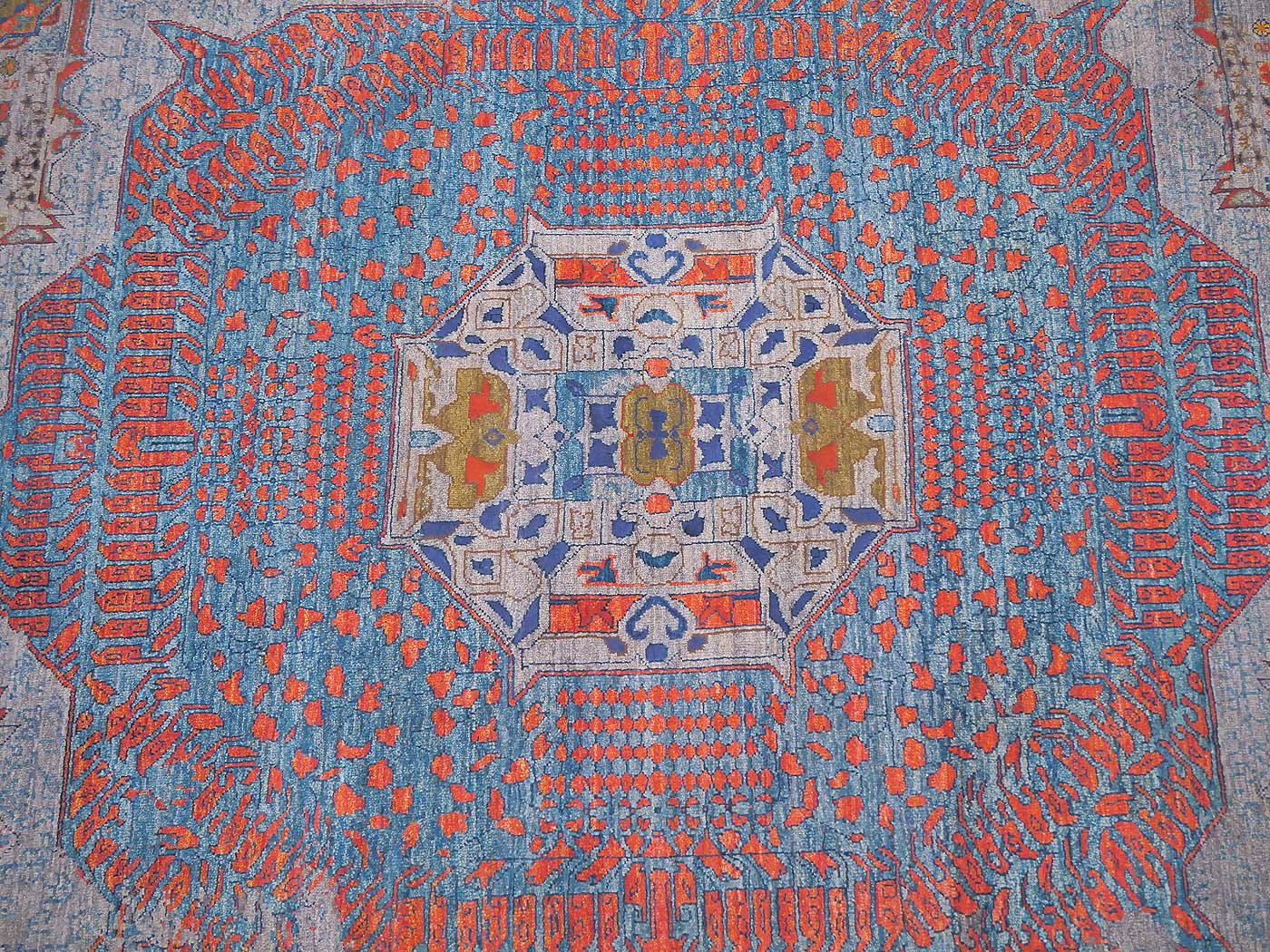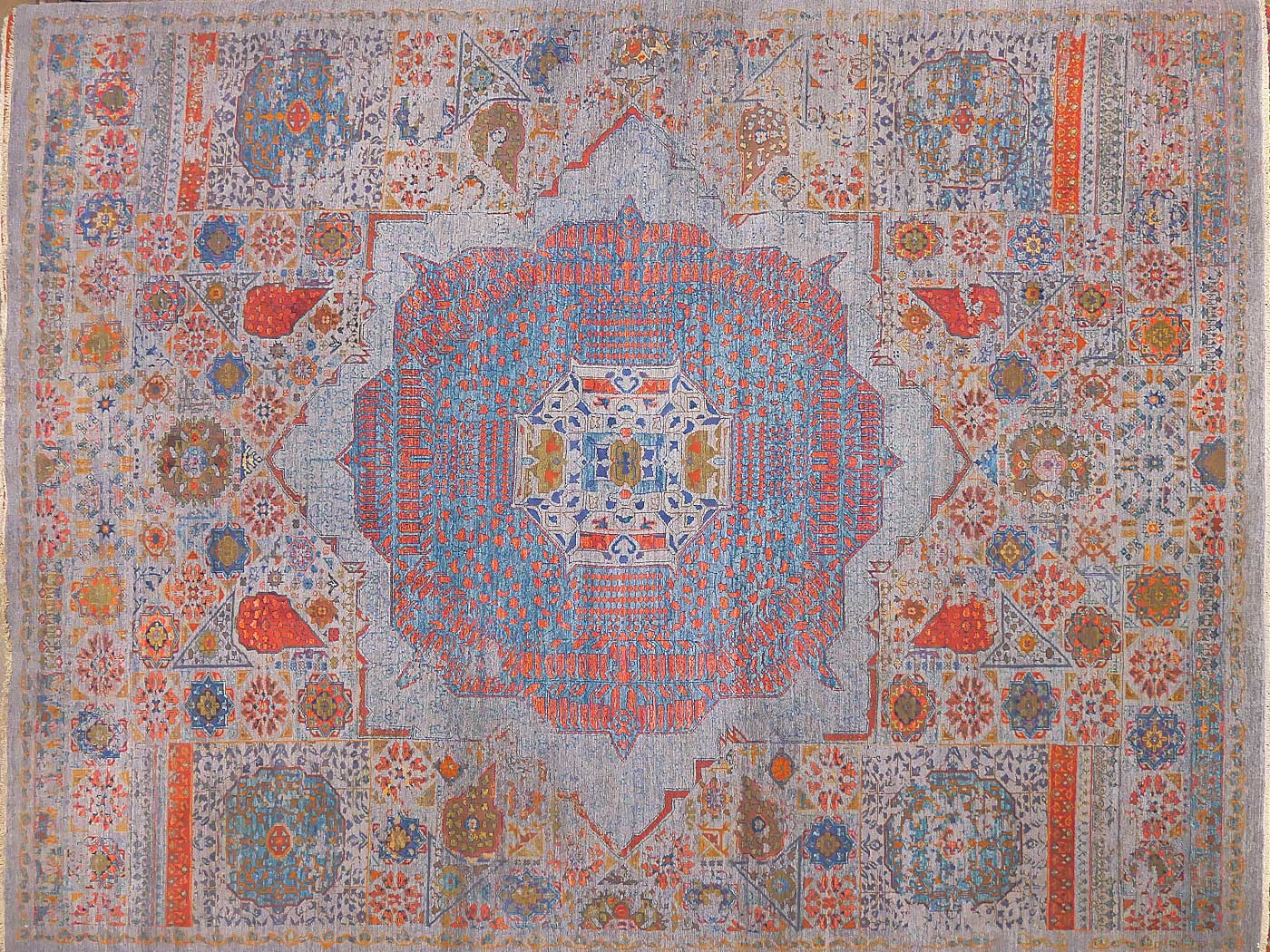 Hand knotted pile rug rug made using natural dyes and handspun wool and pure silk highlights. The knotting is over 90kpsi. This rug comes features a Mamluk design with a contemporary twist; some design elements are skillfully “erased” in the design process revealing the background color. This striking rug has a design inspired by rugs commissioned for Mamluk Sultans in their court workshops centuries ago. These unique geometric rugs are equally well suited for contemporary or traditional interiors. Entirely hand made. FREE Shipping and Easy Returns.