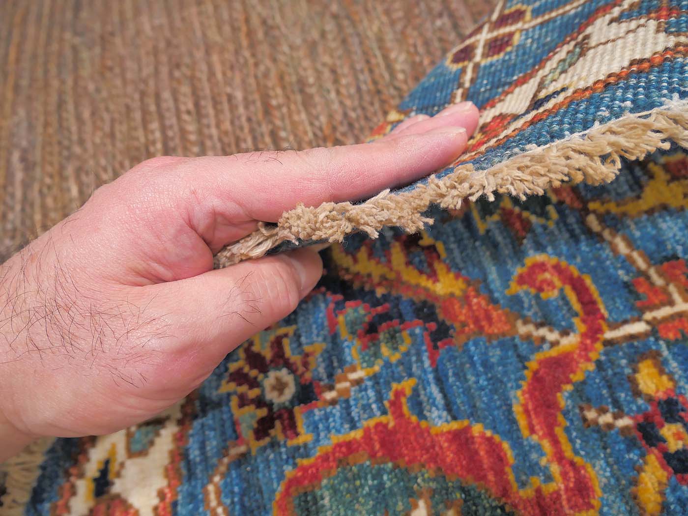 Hand knotted pile rug made using natural dyes and handspun wool. This rug is woven with around 90kpsi and gorgeous NW Persian Heriz design in blue tones that was commissioned especially for the Nomad Rugs team. Weaving takes place in the northern areas of Afghanistan where the art of weaving is reverently passed on from mother to daughter with the weaving of these rugs taking place in individual family homes. This rug was custom designed and woven in collaboration with Nomad Rugs and entirely hand made. FREE Shipping and Easy Returns.