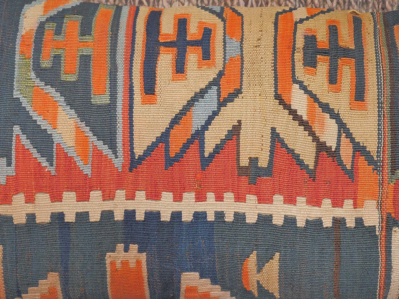 11″x20″ This beautiful pillow if made from a vintage fragment of a Caucasian kilim rug. It is firmly stuffed with a custom pillow insert and has a sturdy cloth backing with a zipper to remove the pillow insert for easy cleaning. FREE Shipping and Easy Returns.
