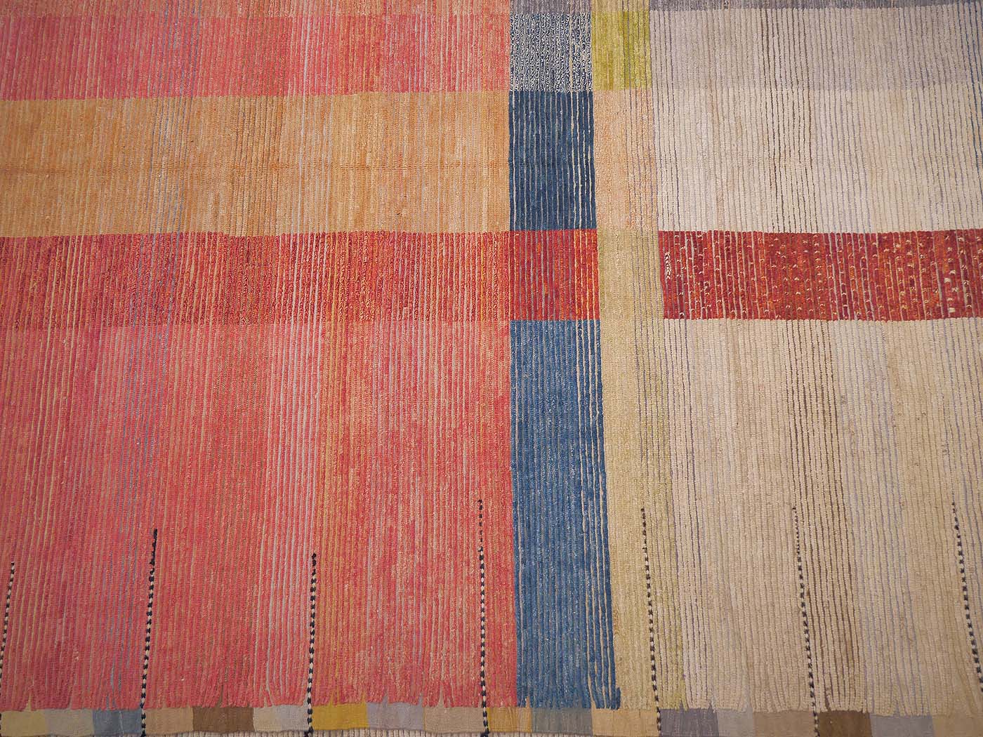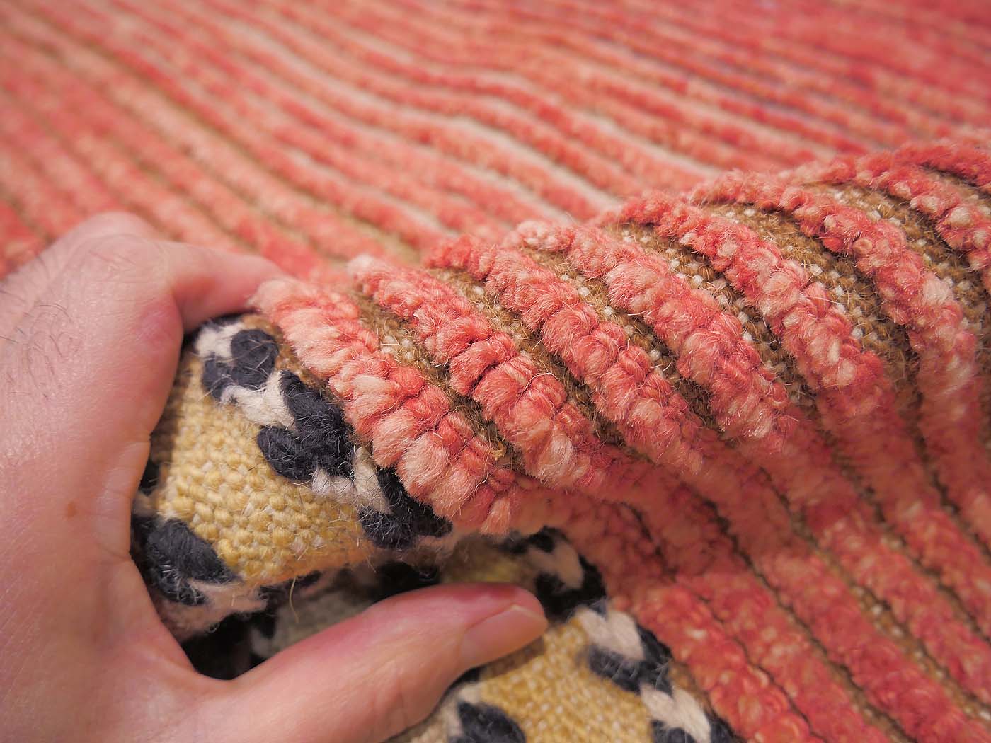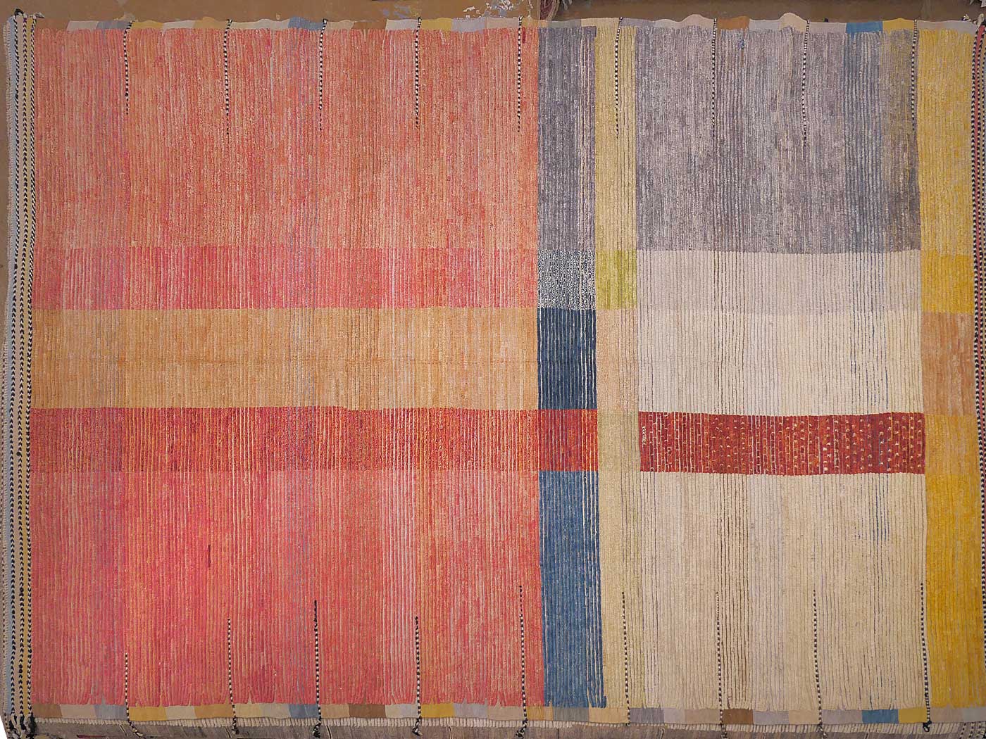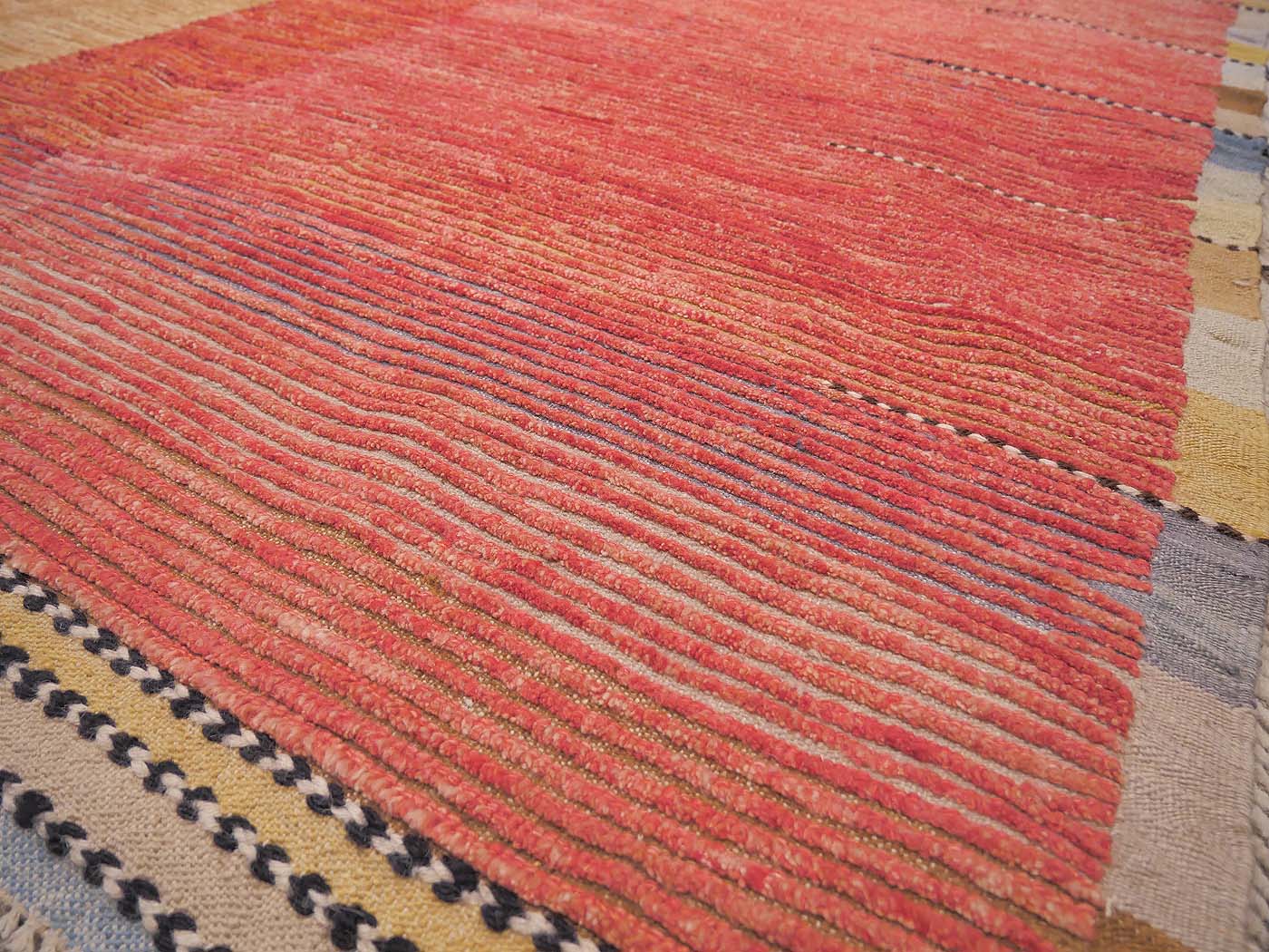 Hand knotted pile rug made using all long shag handspun wool. This wonderful carpet is modeled after an antique Moroccan tribal rug. It is knotted in a textured weave with rows of flat woven kilim between rows of hand knotted pile at around 40kpsi. This coarse knotting along with the kilim weave gives a wonderful texture and “modern tribal” feel. Inspired by the many wonderful tribal rugs of the Berber weavers of Morocco. Add unique texture and design to your home and very soft texture underfoot. Entirely hand made. FREE Shipping and Easy Returns.
