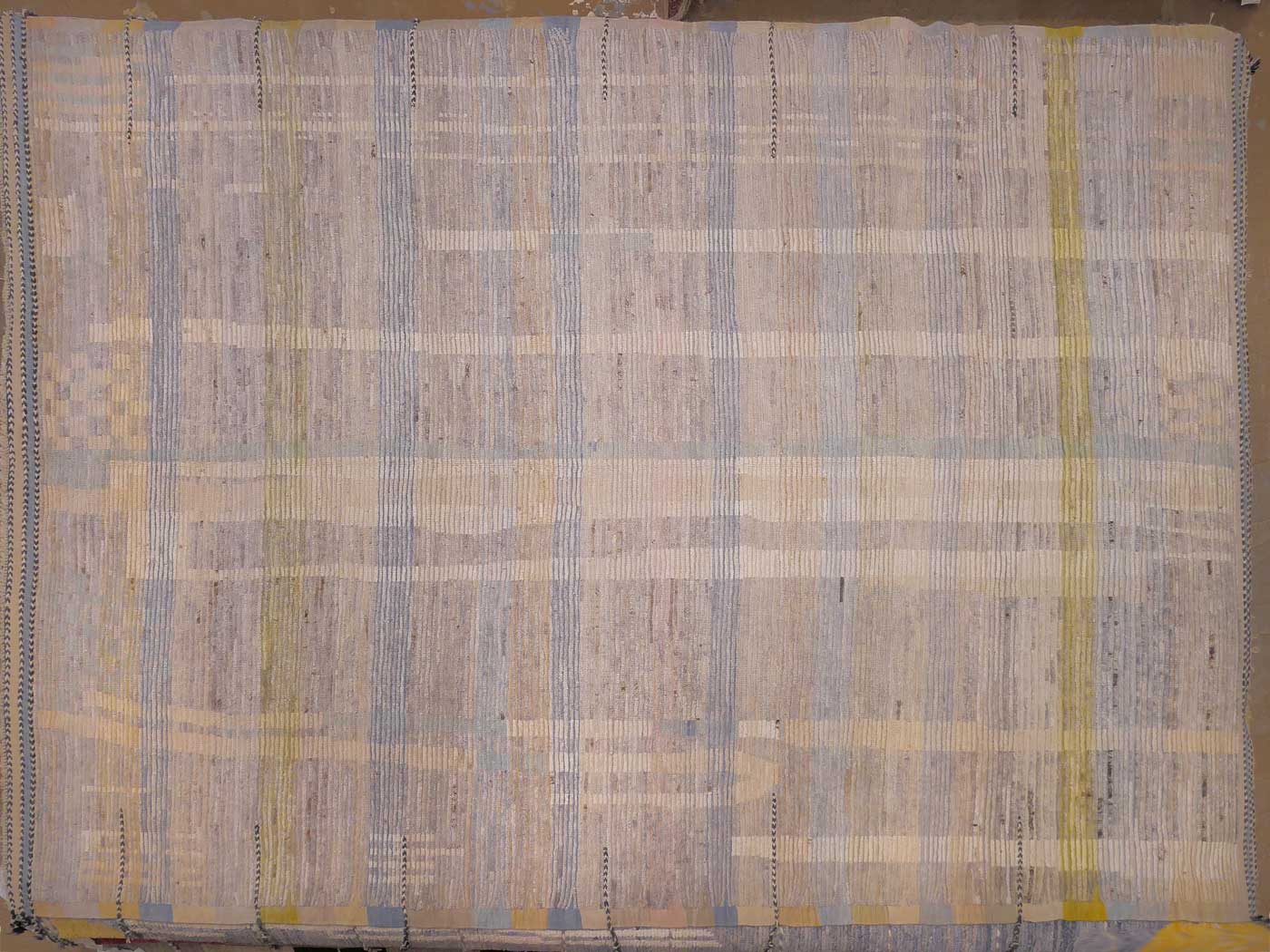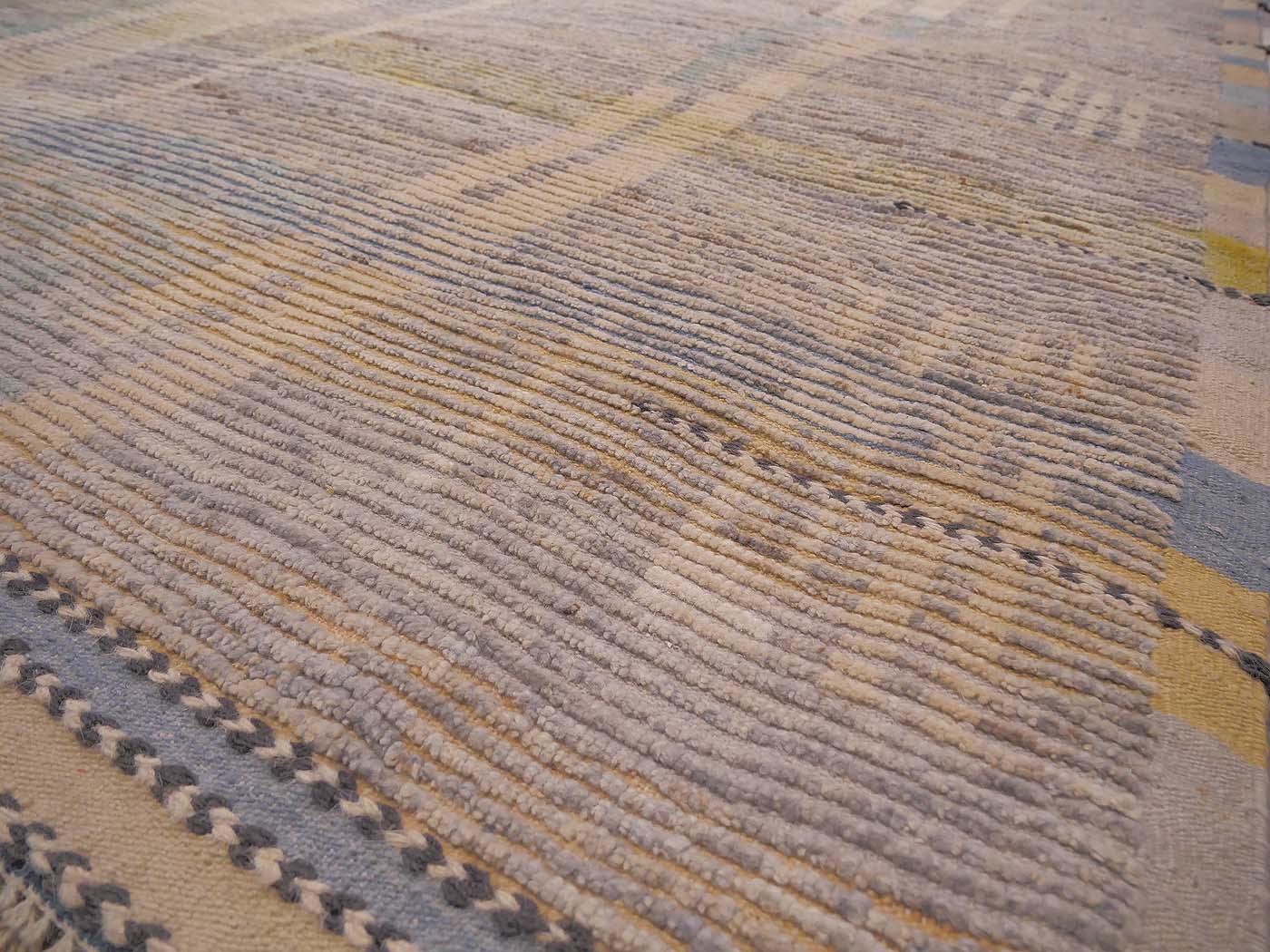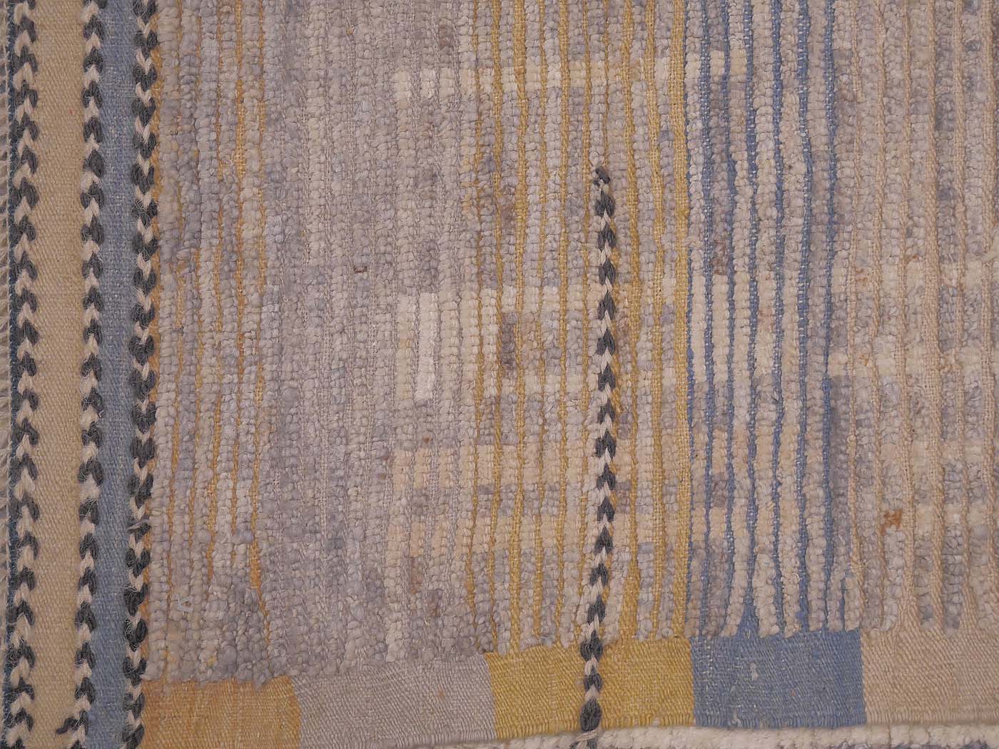 Hand knotted pile rug made using all long shag handspun wool. This wonderful carpet is modeled after an antique Moroccan tribal rug. It is knotted in a textured weave with rows of flat woven kilim between rows of hand knotted pile at around 40kpsi. This coarse knotting along with the kilim weave gives a wonderful texture and “modern tribal” feel. Inspired by the many wonderful tribal rugs of the Berber weavers of Morocco. Add unique texture and design to your home and very soft texture underfoot. Entirely hand made. FREE Shipping and Easy Returns.
