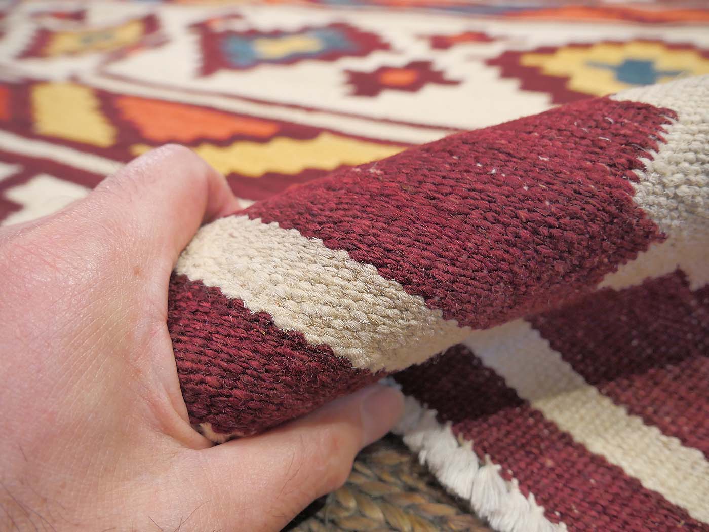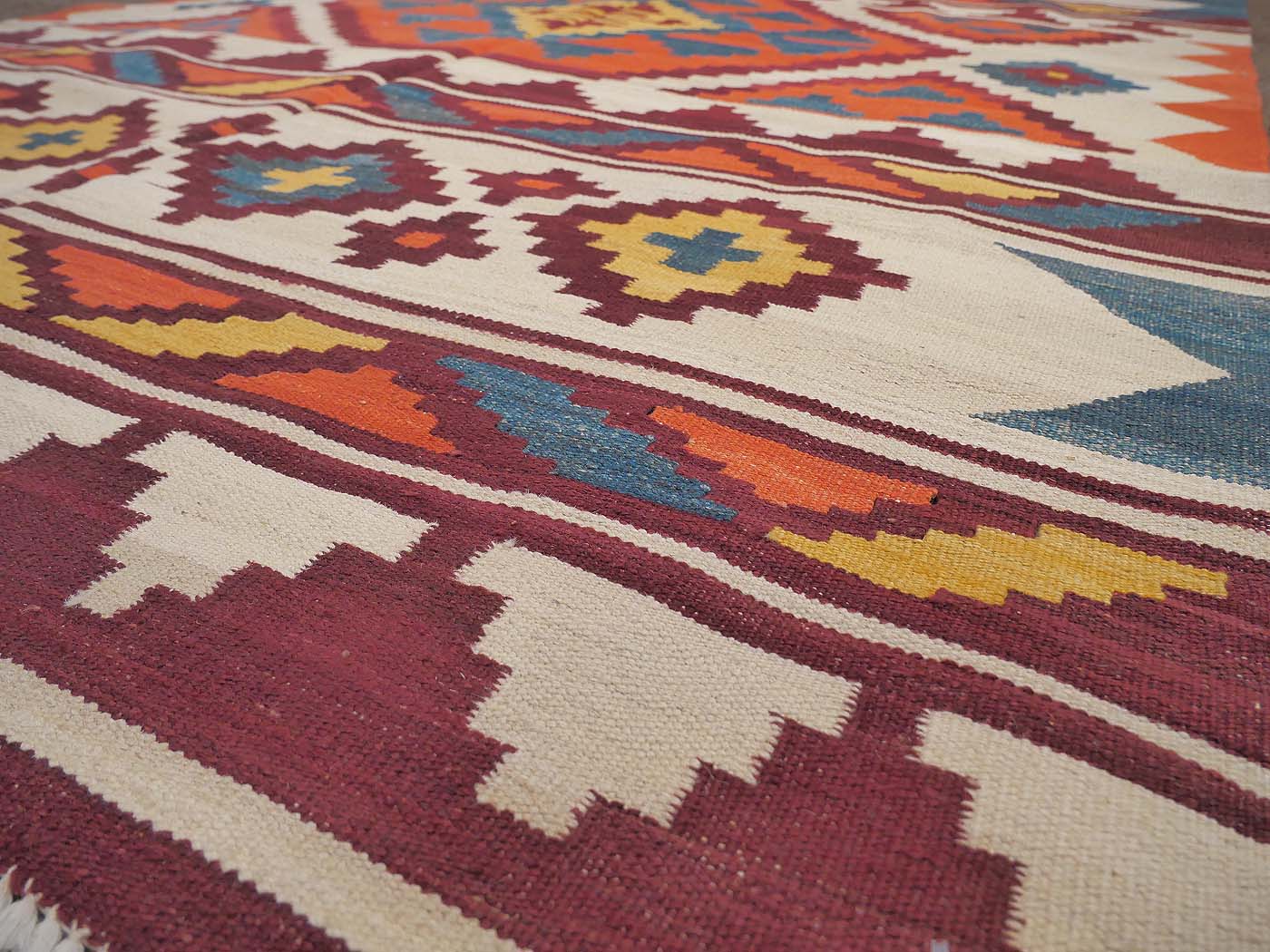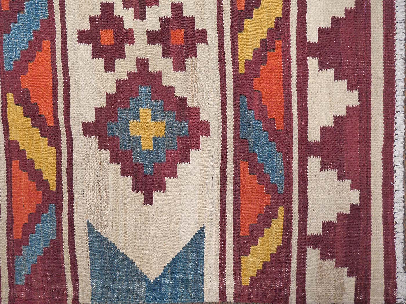 This handmade kilim rug is tightly flat woven in a tapestry weave technique. Made exclusively for Nomad Rugs with natural dyes and handspun wool. These kilims have a slightly primitive texture and a rich abrash which makes them look much like the antique kilims prized by collectors. We search far and wide for the designs that we gleam from an eclectic array of sources including classic tribal flat weaves, world textiles and modern abstractions. These are simply the nicest hand woven kilim rugs made today. FREE Shipping and Easy Returns.